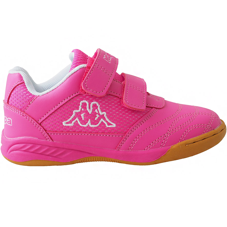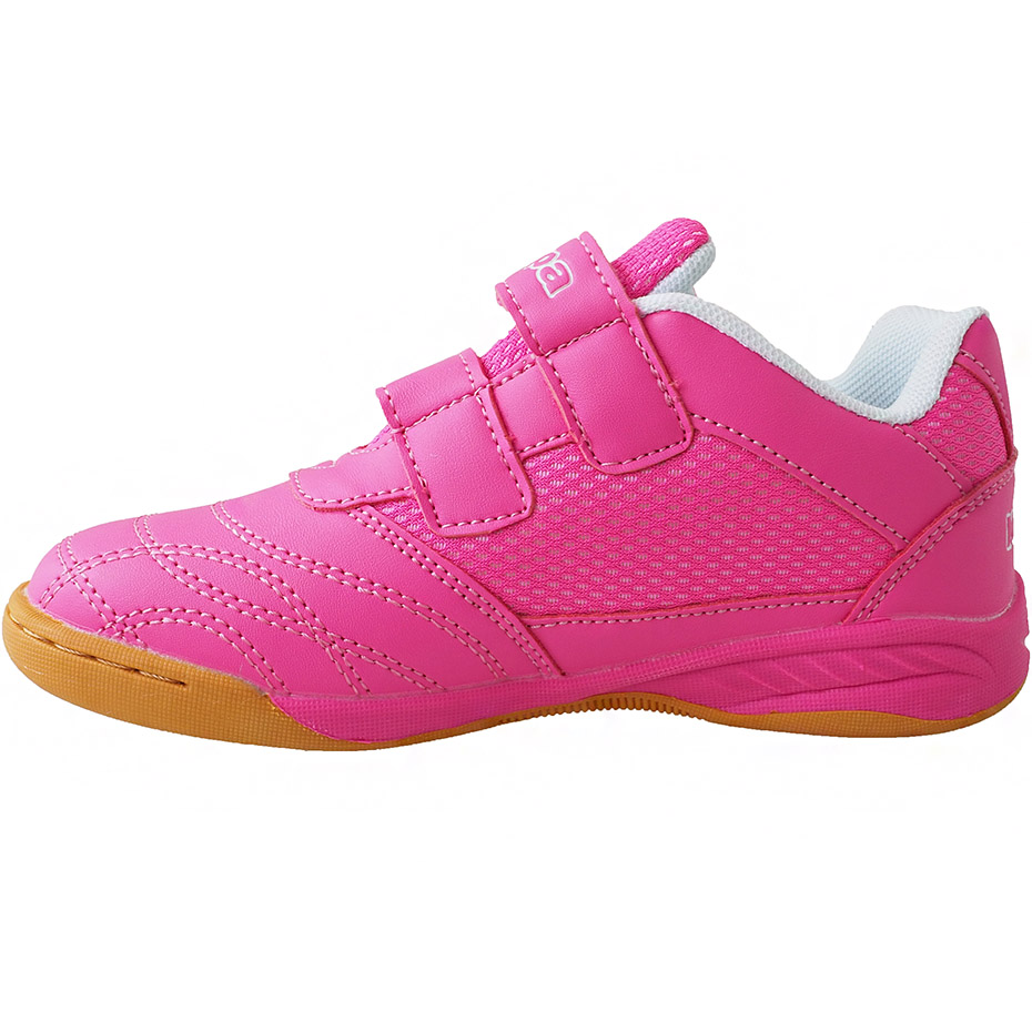 Dziecięce halówki Kappa zaprojektowano dla najmłodszych miłośników halowych sportów. Różowa konstrukcja w połączeniu z białymi detalami tworzy dynamiczną sylwetkę butów sportowych dla dzieci. Syntetyczna cholewka z klasycznymi przeszyciami i siateczkowymi panelami. Zapięcie na dwa paski na rzep. Tekstylna wyściółka. Wyjmowana wkładka. Solidna, gumowa podeszwa.