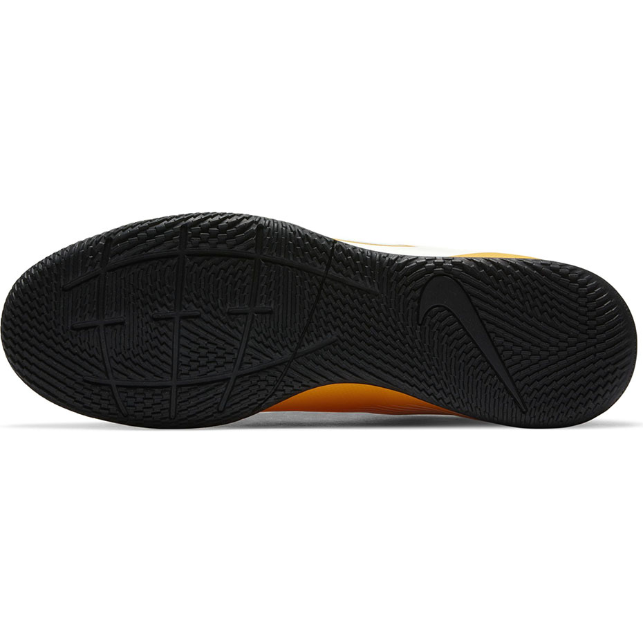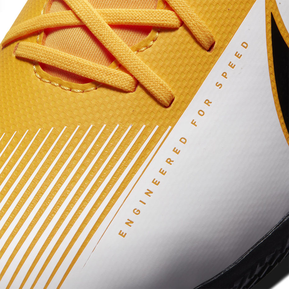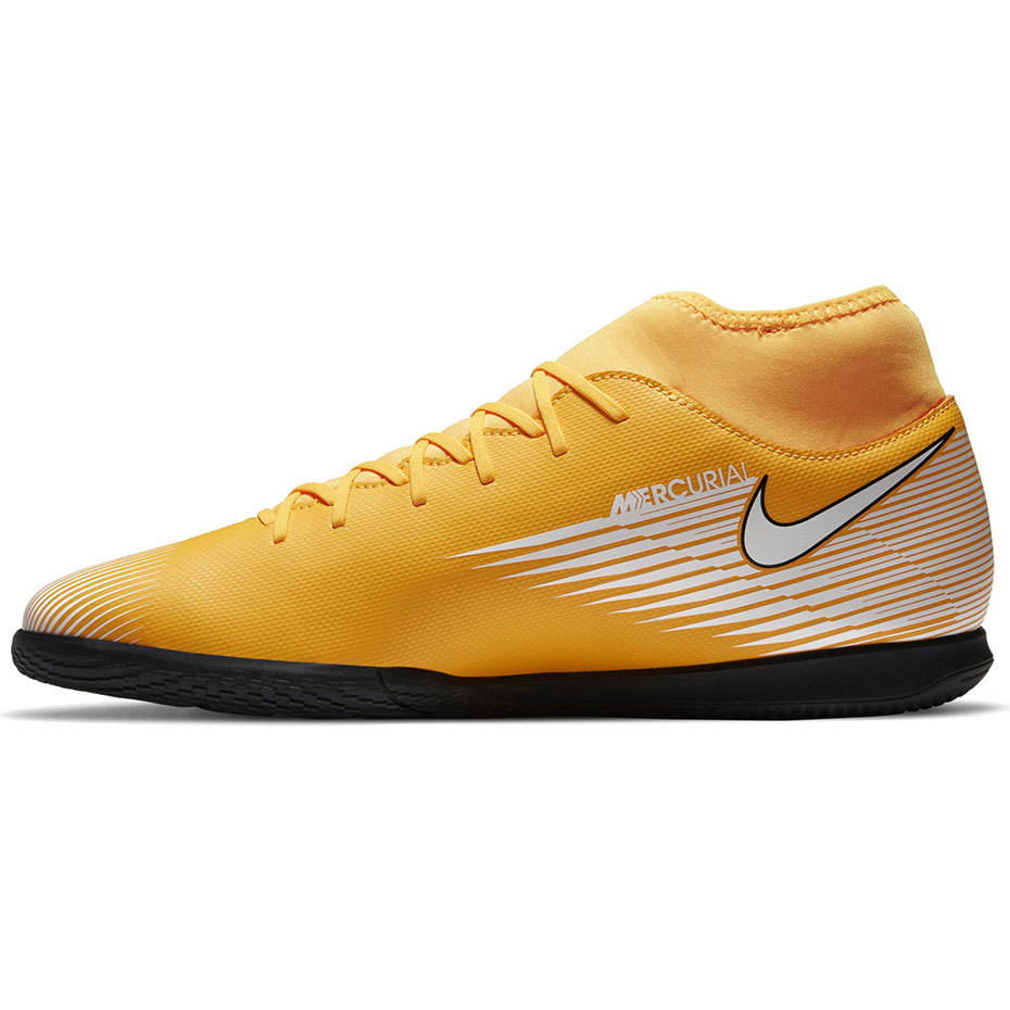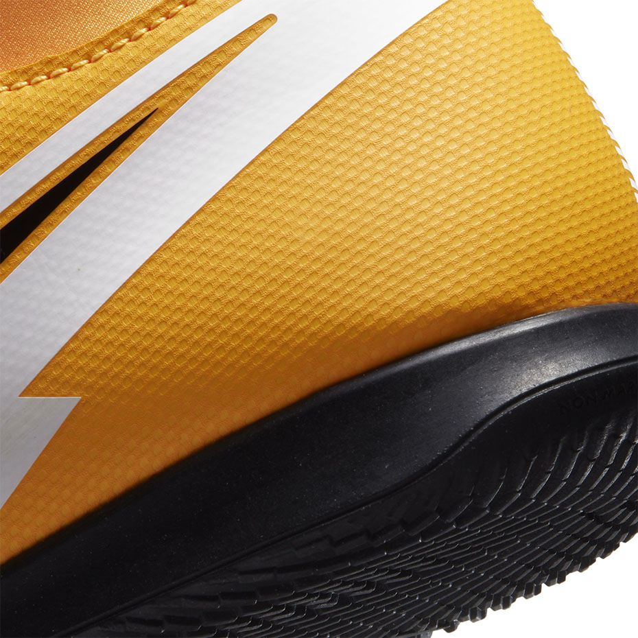 Amatorskie buty piłkarskie Nike Mercurial Superfly 7przeznaczone są mężczyznom, którzy preferują rozgrywki na halach sportowych. Pomarańczowo-białe halówki pochodzą z kolekcji Daybreak. Niskoprofilowany kołnierz Dynamic Fit. Cholewka ze skóry syntetycznej. Podeszwa z technologią non-marking. Ambasadorami linii Mercurial są najlepsi piłkarze: Cristiano Ronaldo, Kylian Mbappe i Neymar.
