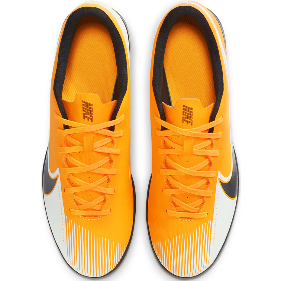 Męskie buty piłkarskie Nike Mercurial Vapor 13 przeznaczone do gry na sztucznych nawierzchniach trawiastych (turf). Pochodzą z kolekcji Daybreak. Cholewka wykonana z miękkiej skóry syntetycznej, odpowiada za trwałość i lepsze czucie. Wytłoczony wzór umożliwia lepszy kontakt z piłką. Twarzą linii Mercurial jest Cristiano Ronaldo. Poziom: rekreacyjny.